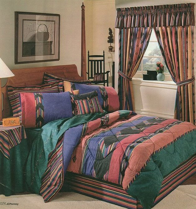 This oh-so-’90s bedding set looks like it was inspired by a Coogisweater, is proof that this era had a love affair with patterns. The bed skirt, pillow shams, and underside of the comforter (it’s reversible, of course) are patterned with multicolor stripes, and the design on the ‘top’ side of the comforter is, well, indescribable. Multi-colored patterns made of abstract, geometrically influenced textile designs were probably the most popular variety of the ’90s.