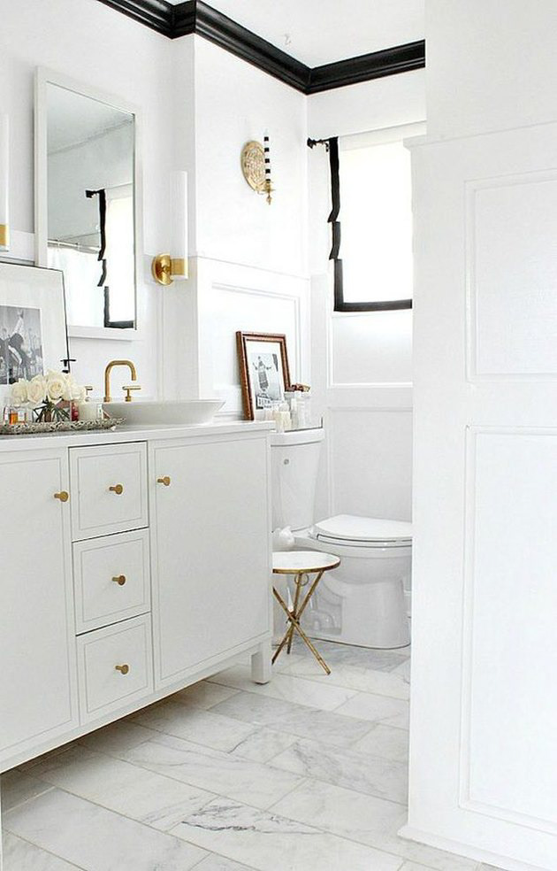 There are lots of ways to use black trim, and you don’t have to be afraid of them! The contrast of black trim against the white walls and floors of this small bathroom catches the eye, and makes the room feel taller as it draws your gaze upward. If you’re not ready to go all the way black, just pick a hue that’s dark enough to create a stark contrast against the color of your walls.