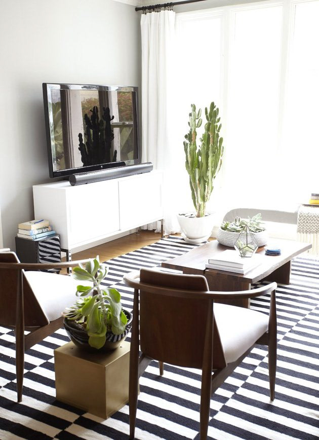 Be bold with your rug choice. Don’t write off its decor potential just because it’s underfoot. Find ways to work a patterned rug into your room that enhance the space without overwhelming it. A rug striped in shades that are complementary to the room’s color palette is a good choice for a studio apartment.