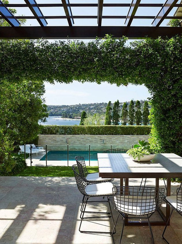 Though it doesn’t appear nearly as often as its wood, metal, or canvas counterparts, glass is still a perfectly viable material for patio roofing. This beautifully modern patio covering protects you from all of the elements except sunlight, so don’t forget your sunglasses and sunscreen. We love how the modernity of this glass roof with black frame is softened by a verdant trellis that transitions seamlessly into the lawn and pool, beyond.