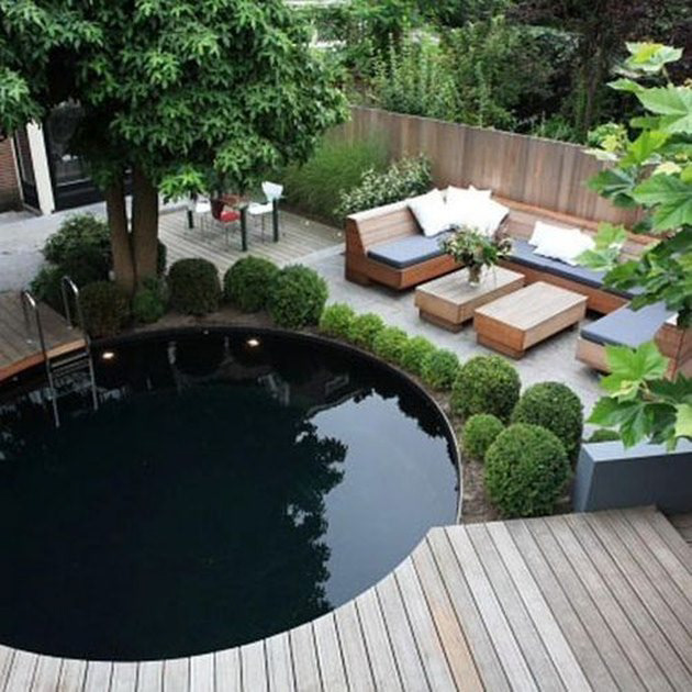 Not every garden needs grass! This grassless backyard gets its greenery from trees, shrubs and bushes (planted in mulch). A large tree helps partially shade the elegantly round swimming pool, which is encircled by an elevated wooden deck and an arc of topiary buxus balls. A large U-shaped sectional couch in the stone patio area provides ample seating.