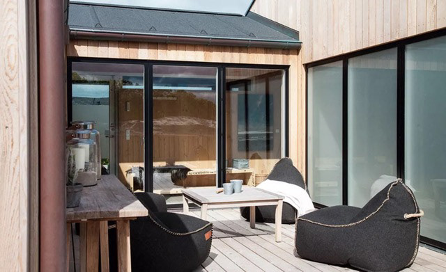 This recently refurbished beach cottage on the northwest coast of Denmark features modern architecture and (appropriately) Scandinavian decor. The entire house is built in neutral-toned raw woods (cedar planks and spruce fillets, if you want to get specific), including the rectangular deck that connects the original home to its new wing. The deck fits in like a courtyard between the two structures and stylistically, it hits all the right spots. It delivers 100% on that aesthetic of practiced minimalism, clean lines, and muted color palettes that we’ve come to know and love from the Norse.