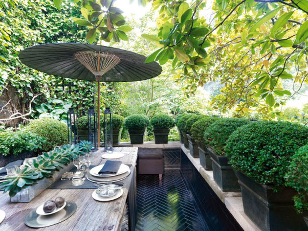 Are we the only ones who always feel a sense of secrecy in rooms that have black subway tiling? Even al fresco, herringbone tiles in black, along with a border of potted topiaries, create a posh sense of privacy and mystery on this London balcony. It turns out that subway tiling is good for more than just kitchens and bathrooms.