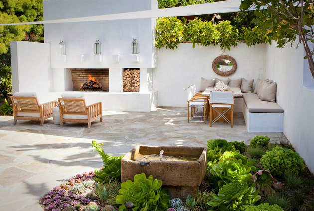 The sleek black slate of this Dutch home’s patio area perfectly contrasts against its minimalist white stucco walls. The L-shaped wooden deck deftly tucked into the corner, along with choice touches of greenery, subtly incorporate natural elements (and pops of color) into this modern design.