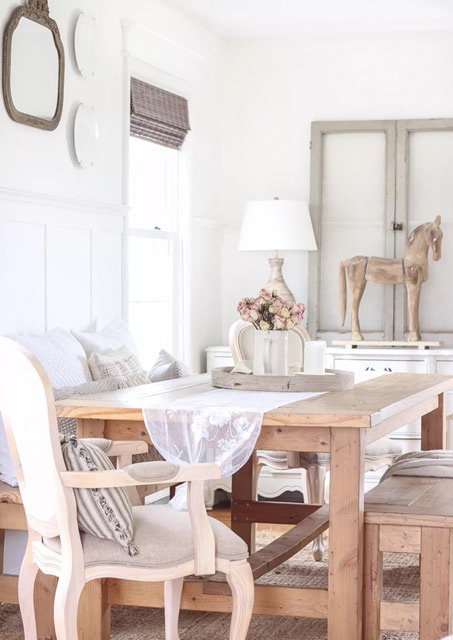 When it comes to French country style, the more reclaimed wood you can incorporate, the better. The cooking and dining areas are usually the first spaces that you think of when picturing a provençal home, and the reclaimed wood furniture that fills them is one of the region’s most iconic design elements — symbols of aristocratic opulence that have been made wonderfully utilitarian. You’ll often see a grand wooden statement piece, like this gorgeous bench that designer Leah Bailey incorporated into a quaint mud room nook.