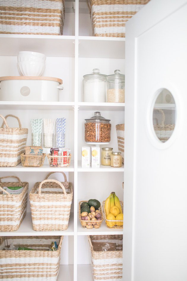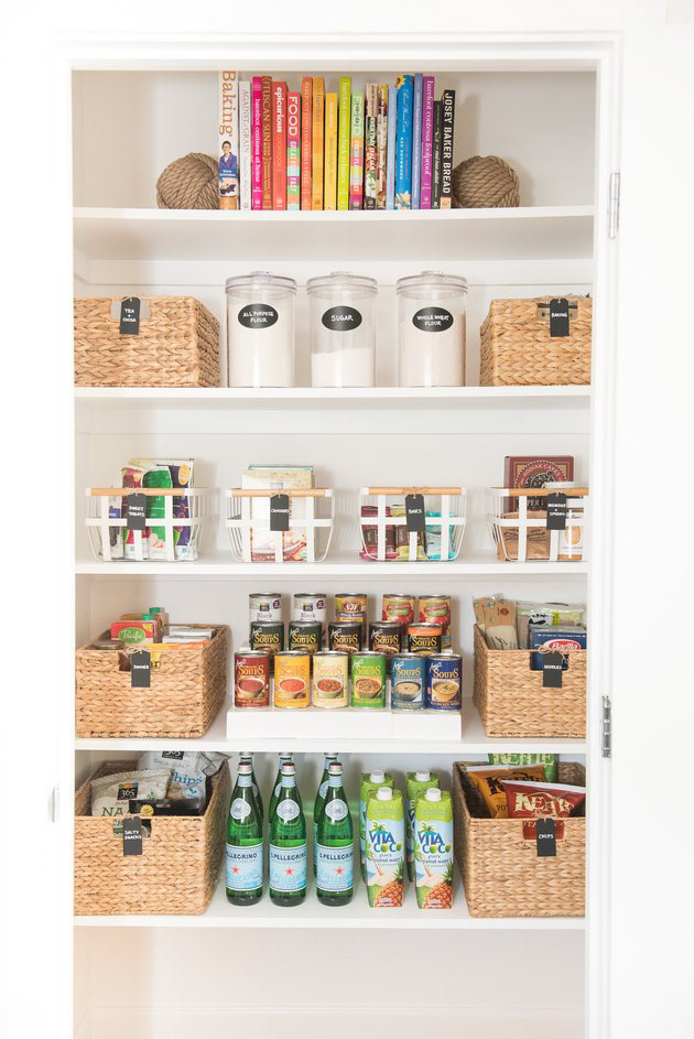 For pantries (as well as cabinets), organizing with baskets and bins is a game-changer. Not only are they available in a wide variety of stylish options and convenient sizes, but they’re also incredibly handy for grouping things together. Don’t forget to include a designated “miscellaneous” basket or bin to serve as a catch-all container for the items you have trouble finding a home for.
