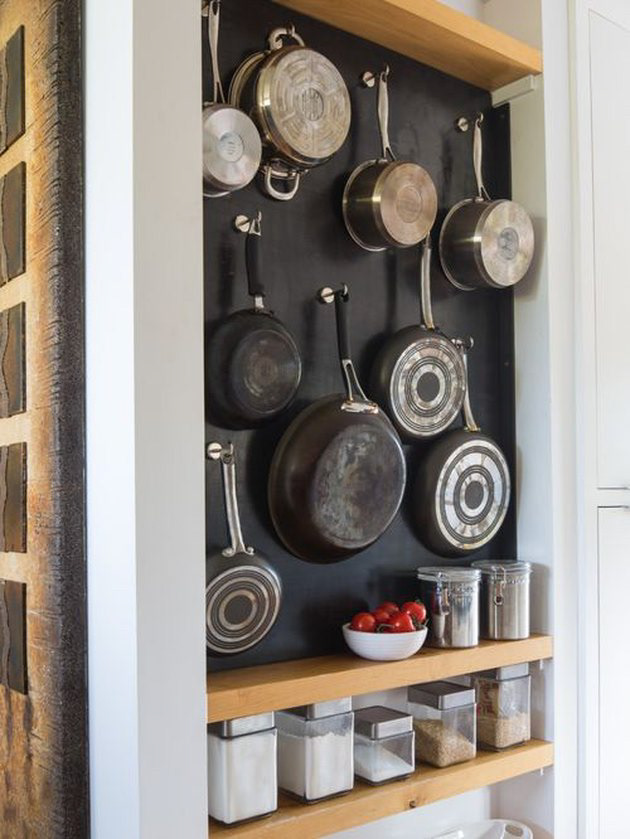 If you cook regularly, it can be a real hassle having to dig through your cabinets looking for your favorite skillet. Instead, try dedicating one wall in your pantry to hanging your pots and pans. This way, you’ll always have quick and easy access anytime you want to turn up the heat in the kitchen.
