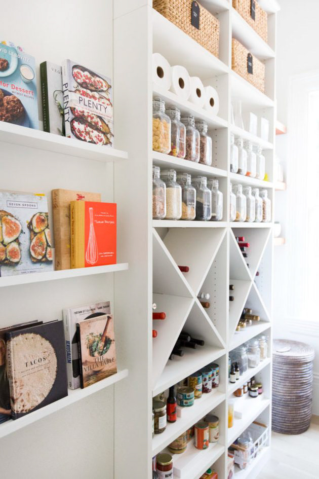 If you fancy yourself a foodie, we’d imagine that some of your counter space is dedicated to your stash of Gwyneth Paltrow cookbooks and prized bottles of Merlot. But these can take up quite a bit of space (especially in a small kitchen), so think about how your pantry could accommodate these items. Do you have room for a cookbook shelf? Or an empty square of cabinetry that could be fashioned into a wine rack?