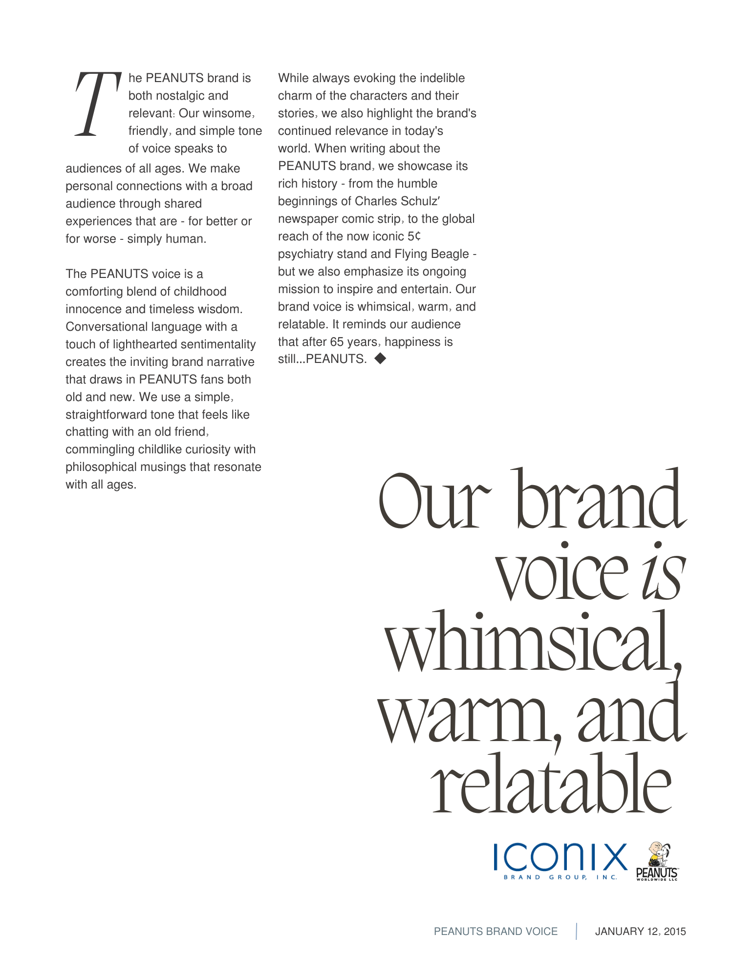 Peanuts rebrand style guide excerpt including voice and tone guidance.